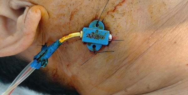CVC(中心静脈カテーテル)は、径の太い静脈(頚部・鎖骨下・鼠径)に挿入されるカテーテルで、高カロリー輸液、昇圧剤、抗菌薬、化学療法、血液浄化、中心静脈圧モニタリングなど、幅広い目的で使用されます。比較的太い静脈を使用するのでどのような方にも挿入することが出来ますが、定期的な入れ替えが必要です。 CVCの挿入はPICCの挿入と同様に清潔操作で局所麻酔を用いておこないます。所要時間の目安は15~30分程度です。