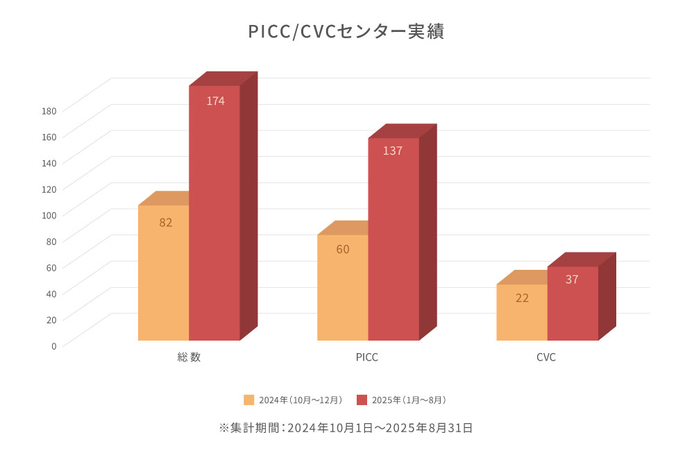 当法人ではすべての血管内留置デバイスに対応する「PICC/CVCセンター」を設立し、入院中の患者さんだけではなく、地域にお住まいの在宅患者さんも含めてお手伝いをさせていただくこととしました。